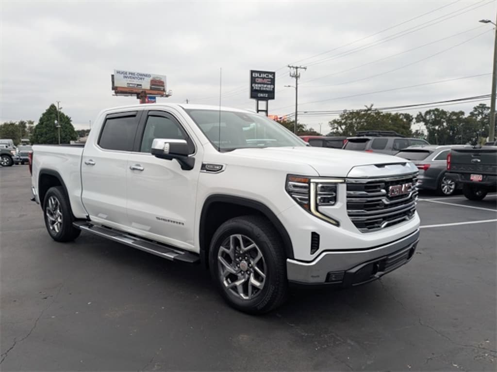 Clean CARFAX. CARFAX One-Owner. Summit White 2022 GMC Sierra 1500 SLT RWD 10-Speed Automatic EcoTec3 5.3L V8 APPLE CAR PLAY, ANDROID AUTO, USB PORTS, BLUETOOTH, 10-Speed Automatic, Jet Black Leather, 120-Volt Instrument Panel Power Outlet, 170 Amp Alternator, 2 Charge/Data USB Ports, 2 Type-C Charge-Only Rear USB Ports, 20" Polished Aluminum Wheels, 6-Speaker Audio System Feature, Auto-Locking Rear Differential, Auxiliary External Transmission Oil Cooler, Chrome Header & Chrome Grille Insert Bars, Chrome Wheel To Wheel Assist Steps, Color-Keyed Carpeting Floor Covering, Compass, Deep-Tinted Glass, Electric Rear-Window Defogger, Electrical Steering Column Lock, Floor-Mounted Center Console, Front Bucket Seats, Front Frame-Mounted Black Recovery Hooks, Front Rainsensing Wipers, GMC Connected Access Capable, HD Rear Vision Camera, Heated Steering Wheel, High Capacity Suspension Package, Hitch Guidance w/Hitch View, In-Vehicle Trailering App, Integrated Trailer Brake Controller, Keyless Open & Start, LED Cargo Area Lighting, Manual Tilt-Wheel & Telescoping Steering Column, Navigation System, OnStar & GMC Connected Services Capable, Perimeter Lighting, Power Door Locks, Power Front Passenger Windows w/Express Up/Down, Power Front Windows w/Driver Express Up/Down, Power Rake & Telescoping Steering Column, Power Rear Windows w/Express Down, Preferred Equipment Group 4SA, Premium Bose 7-Speaker Sound System, ProGrade Trailering System, Push Button Start, Rear Wheelhouse Liners, Remote Vehicle Starter System, SiriusXM w/360L, SLT Convenience Package, SLT Premium Package, Standard Suspension Package, Steering Wheel Audio Controls, Theft Deterrent System (Unauthorized Entry), Trailering Package, Ventilated Driver & Front Passenger Seats, Wi-Fi Hotspot Capable, Wireless Charging, Wireless Phone Projection.